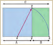 “黄金分割”公式可以从一个正方形来推导,将正方形底边分成二等分,取中点X,以X为圆心,线段XY为半径作圆,其与底边直线的交点为Z点,这样将正方形延伸为一个比率为5:8的矩形,Y点即为“黄金分割点”,A:C = B:A = 5:8。