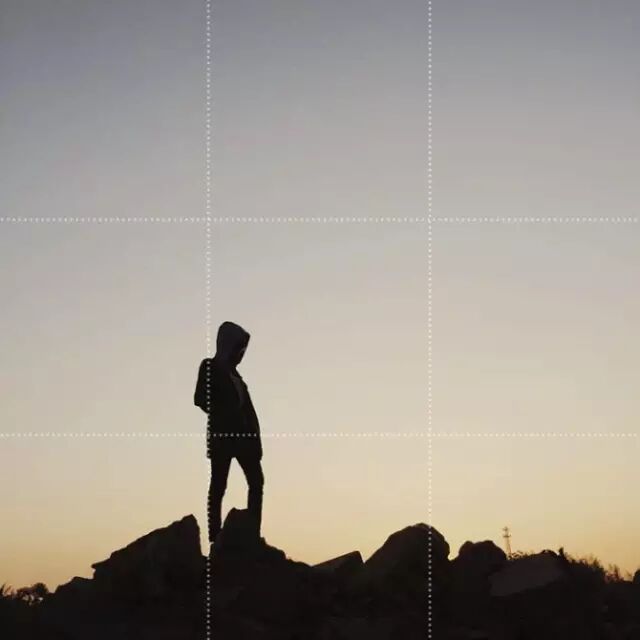 以该照片为例,摄影师的拍摄主体是人在山顶的剪影,所以将人摆在水平线与垂直线的交叉点处,而不是最中间的方格内。