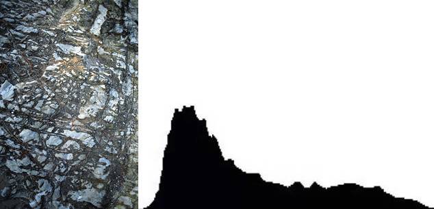 ▲上图的岩石是偏深色,所以正确曝光下,直方图分布应该偏左。