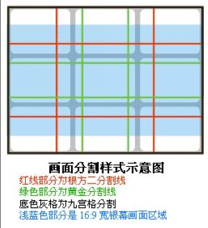 黄金分割:按照黄金分割率1.618比率在矩形中平行旋转切割四次,就得出四条黄金分割线。在传统平面构图中,对视觉中心最保守的办法是“九宫格”法,包括现在相机的智能取景对焦功能也是参照此不变法则。