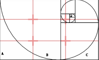 黄金螺旋: 在矩形中按照黄金比率旋进渐进无限分割,切点的连线形成对数螺旋线。