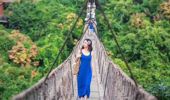 用线条来引导视线,旅途中可以寻找很多线条来作为引导线,然后让被拍摄者站到引导线的终点,比如马路上的斑马线、路边的扶手,室内的楼梯都是能用来做为引导线的,其实说白了线条引导也是前景的一种,都是引领观看照片的人视线聚集到人像当中的一种构图技巧。