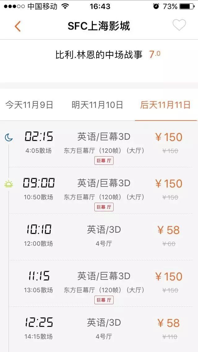 博纳悠唐店对3D/4K/120帧版《比利·林恩》实施的是错峰观影优惠价,每天早上第一场和晚上最后一场非会员价230元,会员价180元;周一至周五18时之前时段非会员价288元,会员价238元;黄金时段以及周六日,非会员价320元,会员价260元。顶配版《比利·林恩》在上海影城的票价,则根据观影不同时段分别有150元、180元、200元三个档位。所以,无论你是身在北方还是南方,想要一睹李安新作的原味真容,都是件费钱的事。