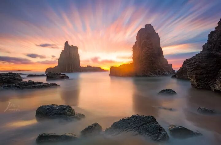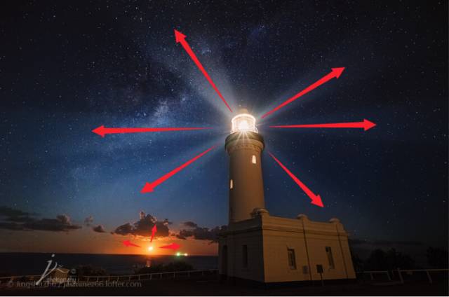 放射线,顾名思义这种线条是呈放射状的,体现扩散或汇聚的视觉效果,会带来很强的冲击力。在放射线中,通常会有一个中心汇聚点,视线随着线条向中心点汇聚或随着线条向外扩散,因此放射线能够令画面充满张力。例如灯塔的光芒,穿透云层的霞光,或用长时间曝光拍摄云在天空中的动态。
