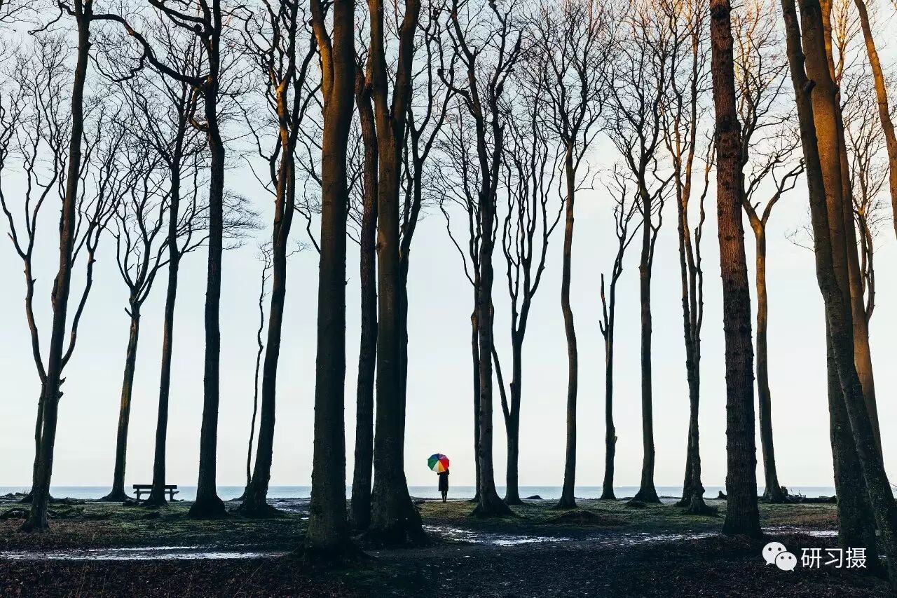 树和人的对比(这种也称作垂直线构图,因为画面中大部分的树垂直排列的,人也是一样。)