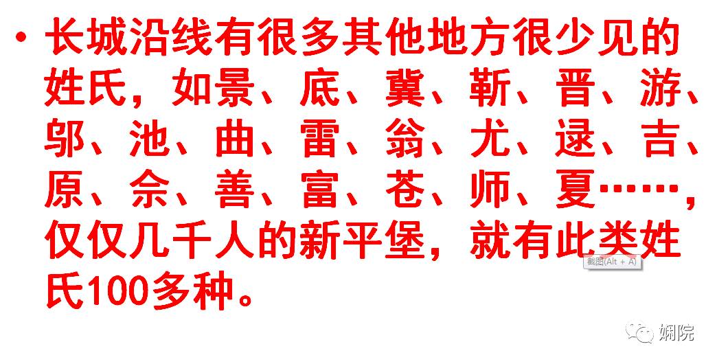那么我刚才有提到姓氏,大家来看,你看那个很多的字都比较少见,但是他是有的,而且就说它在一千多人里,一两千人里有这么多姓,其实就是说明了一点,就说人的这个来源,特别的复杂。基于刚才我所讲的,一个是从物质层面我们来看长城,就是从方方面面的来看它,然后从这个非物质层面也来看它,非物质层面其实也有很多的影响,比如说我觉得太原还稍微好一点,比如说在大同就是有这个,贵少贱老的这种风俗,如果一家只有三间房子好,另外三间房子破,那么三间好房子呢,是给年轻人娶媳妇儿用的,老人是要住在这个破房子里头的,而且如果要说这个打颠倒的话,他们自个儿也就觉得不行,不是那样的,从老到小从社会,整个人都不是那样认可,那么这个就是一种,我觉得就是一个游牧民族的一个遗风。而这个南方的文明体系里呢,你是农业文明,你虽然失去了体力,但是你还可以给他们讲,你靠脑子吃饭,所以说在这种情况下,就说这个尊老爱幼就变得顺理成章了。所以贵少贱老和尊老爱幼,我觉得无关乎道德。