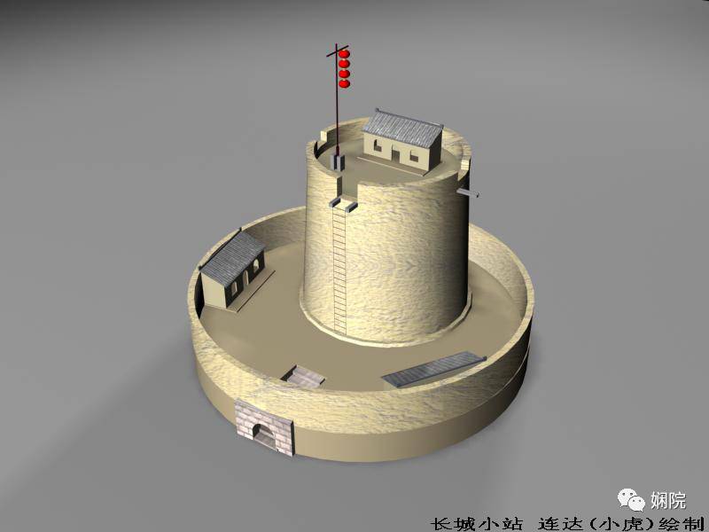 那么我们现在看到的这个呢,这幅图的意思是什么呢,就说在我们山西的北部这个田野里头,经常能够看到外边有个土围子,上边一个土堆,那么这就是它的复原图。这个是用来做什么的,就是用来这个传递信息的,那边这种传递信息的方法是什么,就是我们通常所说的风也好水也好,它在这个传递信息的方法,和我们今天所使用的手机是完完全全的一样的,就说它的原理它的逻辑原理是一样的。