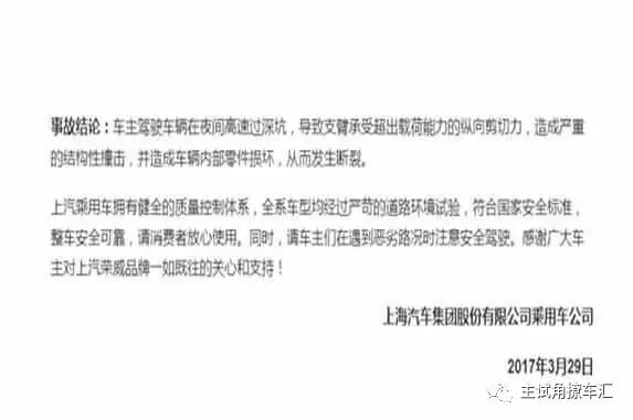 在今年3月初,郑州一位荣威i6车主在过一个坑的时候,不小心将发动机震掉。随后上汽荣威迅速赶往现场并作出回应,问题根本原因在于车主过坑的处理方式有些极端,导致发动机机脚损坏,导致发动机位移。无独有偶,4月份又一位车主在过了一个坑之后,感觉发动机动静不对,打开发动机舱盖一看,发动机出现位移,传说中的“掉了”。
