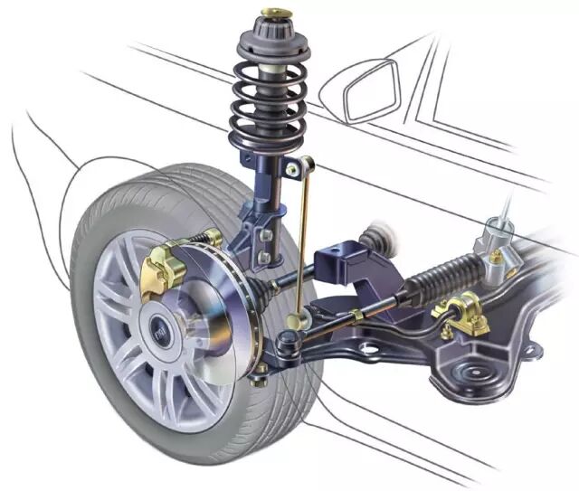 麦弗逊式独立悬架也叫滑柱摆臂式或支柱式独立悬架,是前置前驱动轿车普遍采用的一种前悬架。横摆臂的内端通过铰链与车身相连,外端通过球铰链与转向节相连。减振器的上端与车身相连,减振器的下端与转向节相连,车轮所受的侧向力大部分由横摆臂承受,其余部分由减振器活塞和活塞杆承受。