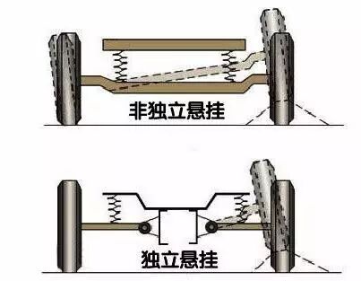 既然有独立悬架,当然也有非独立悬架了。简单来说,独立悬架是两个车轮间没有刚性连接;非独立悬挂两个车轮间是非独立的,之间有硬轴刚性连接。