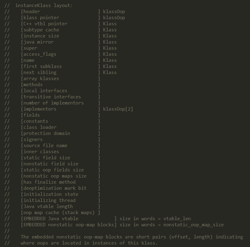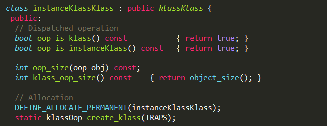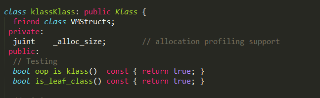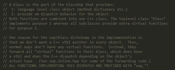 关于为何要设计oop/klass这种二分模型的实现,一个原因是不想让每个对象都包含vtbl(虚方法表),其中oop中不含有任何虚函数,虚函数表保存于klass中,可以进行method dispatch。