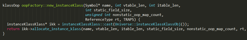 class数据流解析完成后,通过oopFactory::new_instanceKlass创建一个与之对应的instanceKlass对象,new_instanceKlass实现如下: