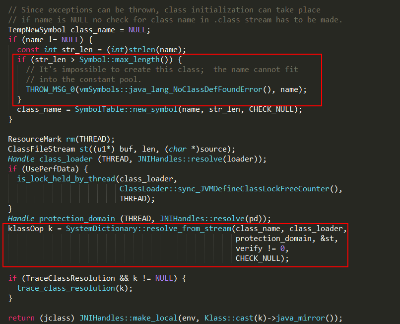 Java中的defineClass1方法是个native方法,说明依赖于底层的实现,在HotSpot中,其实现位于ClassLoader.c文件中,最终调用jvm.cpp中的jvm_define_class_common方法实现,核心的实现逻辑如下: