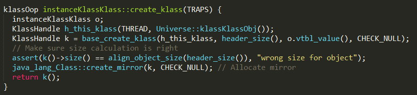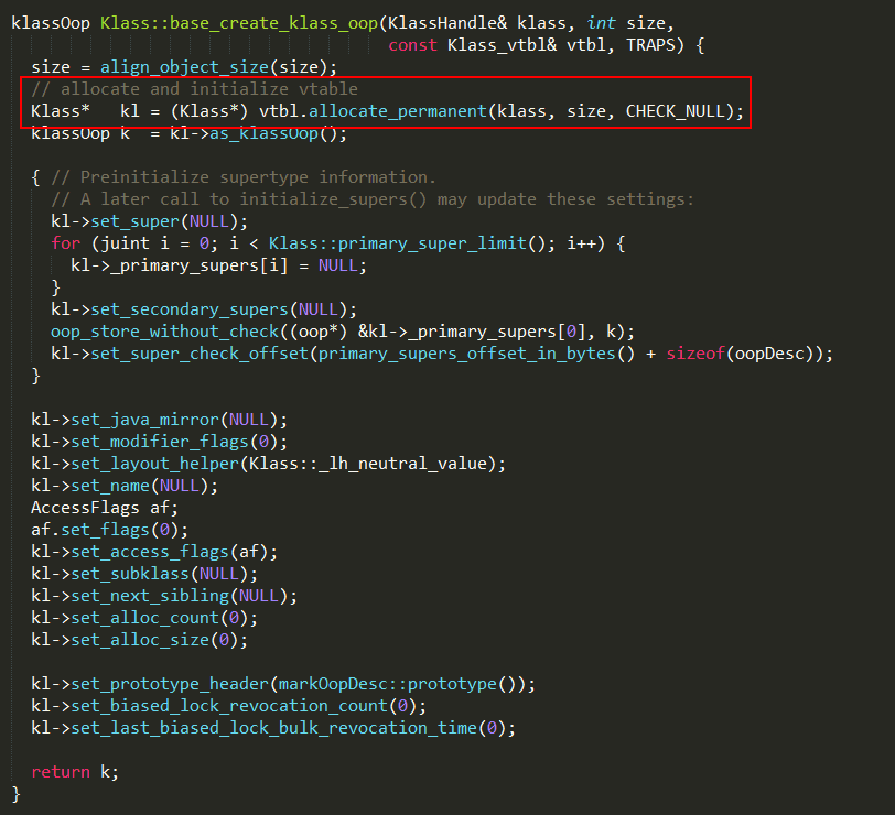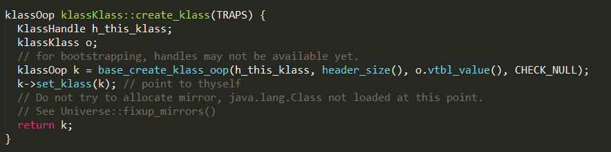1、base_create_klass方法最终通过Klass::base_create_klass_oop方法创建Klass对象,这里是instanceKlass对象,并返回对应的klassOop;
