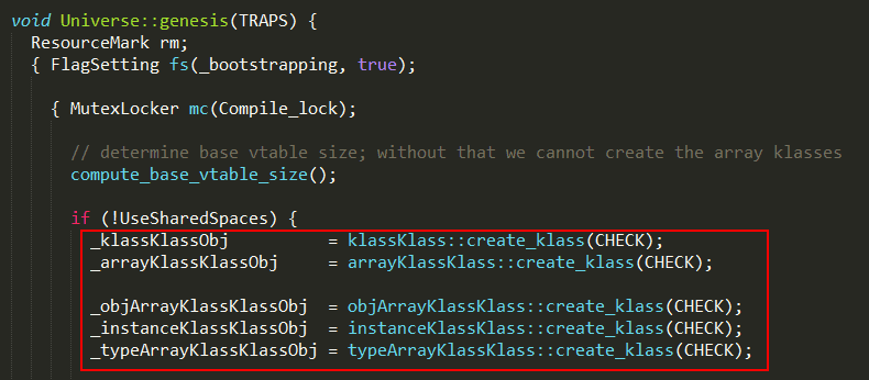 和instanceKlassKlass一样,klassKlass对象也是全局唯一的,虚拟机启动时,会在Universe::genesis方法中初始化,其初始化过程如下: