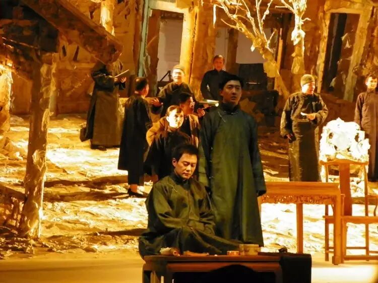 除了国内领军导演、演员的倾力打造,独具匠心的舞台呈现、音乐选用同样让人感到该剧实力不俗。以中国传统殡葬仪礼中的纸人纸马作为材质原型,所有的屋顶及游廊均由一种特殊的白纸覆盖,使得舞台上营造出一种苍白诡谲的色彩。呈15度角的倾斜舞台,也与该剧主题紧密相连,暗示着这个毫无血色和生机的封建家庭即将土崩瓦解。而著名作曲家郭文景的《悬棺》音乐用在这里更是使这个剧别具一番悠远、悲凉、神秘的气息。