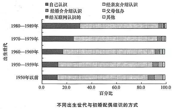 不过夫妻结识方式是存在很大代际间差异的,最为显著的就是年轻一代虽然仍主要通过亲友介绍结识初婚配偶,但自己结识的比例其实正在大幅增加。也就是说可能不少父母仍然觉得亲友介绍才是正常稳妥的方式,但子女已然倾向于自己在学校或工作场所发展恋情,很多恋爱与相亲上的矛盾大概也由此产生。