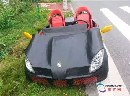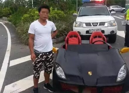 珠海交警韩警官执勤时发现一辆迷你敞篷跑车没车牌,遂将车拦下。只见车头贴“保时捷”车标,车身“做工”粗糙,无疑是改装车。询问发动机位置时,司机交代,该车是用200CC摩托车发动机车头改装而成。他是汽车维修厂员工,该车是他们帮附近一间农庄拼装的车辆。