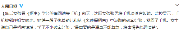 港真,哪怕你不看书,多看看动画片都是好的。听说前几天有个95后女孩,一集不落的看完800集《柯南》,然后凭借从中汲取的破案经验,成功追回了丢失的手机。