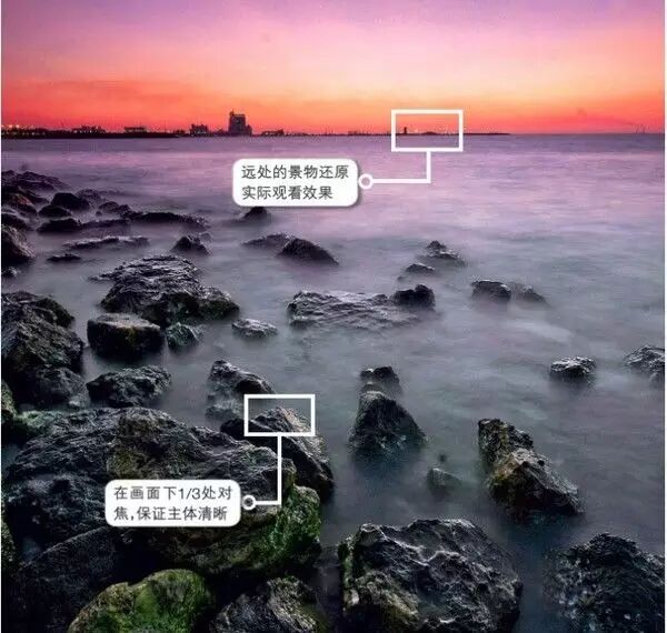 在拍摄风景时,基本要领是收缩光圈,加大景深,这样可以在景深范围内纳入更多的风景。在景深较大的时候,选择单点对焦,把对焦点选在画面1/3处对焦,这时远处的景物也许在景深范围外,但是却更接近实际观看效果。此外,鉴于当前数 码镜头(特别是用在非全画幅相机上时)的制作水平,为了避免光圈太小产生衍射模糊,我们建议使用全画幅相机时,光圈收缩到F16左右;使用APS-C画幅的相机拍摄,光圈收缩到F11就可以了。