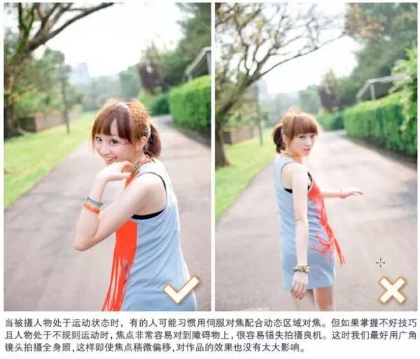 拍摄运动人像依然可以用单点对焦拍摄,使用时应先收缩光圈,并且固定某一点为对焦点,在拍摄中和被摄体保持相同的距离。一旦对当前的状态、构图感到满意的时候即可按下快门进行拍摄。因为已经收小光圈,所以即使和被摄体之间的距 离有细微的变化,也还是保持在景深范围内,对焦仍然是成功的。一般来说数码单反相机的中心对焦点为十字对焦点,它的对焦精度比边缘的对焦点更高。