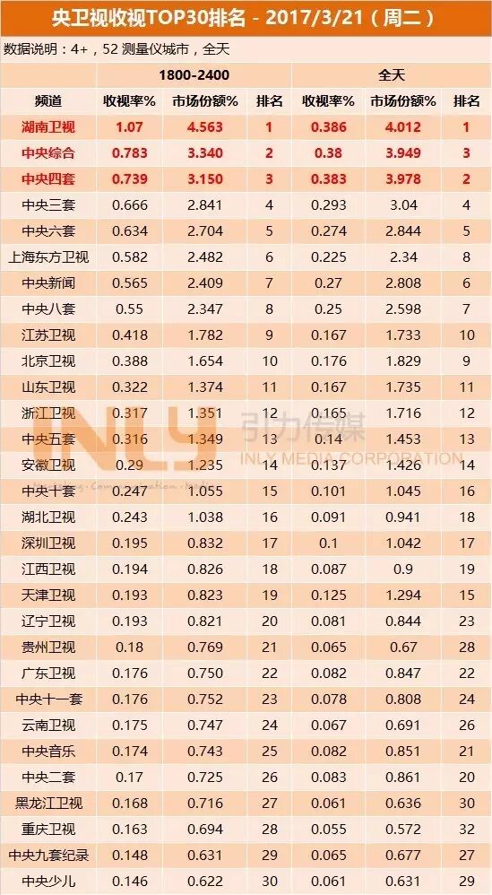 3月21日晚间,湖南卫视排名第一,排名第二、三位。