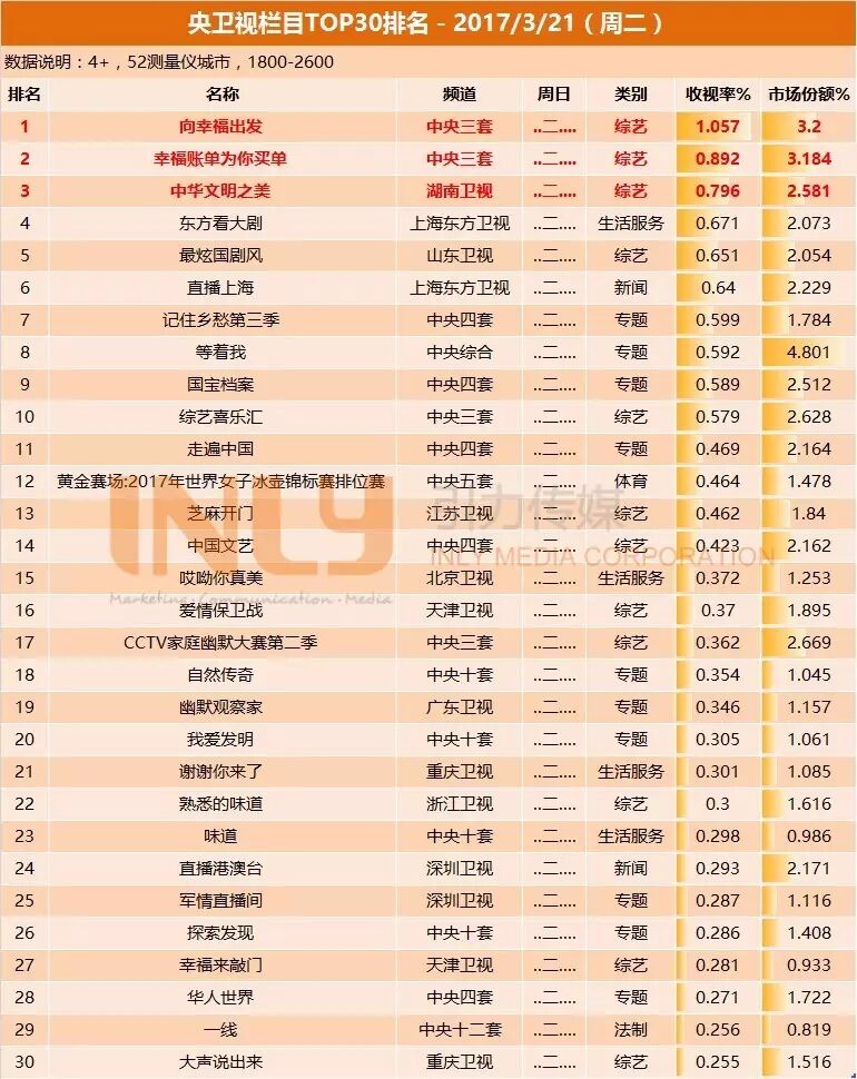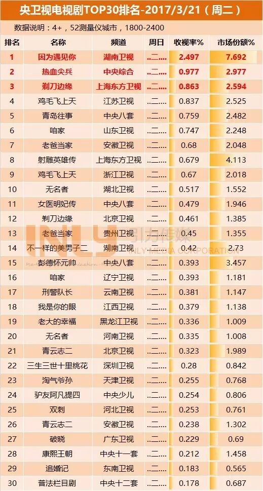 3月21日晚间,湖南卫视《因为遇见你》收视排名第一,、三位。