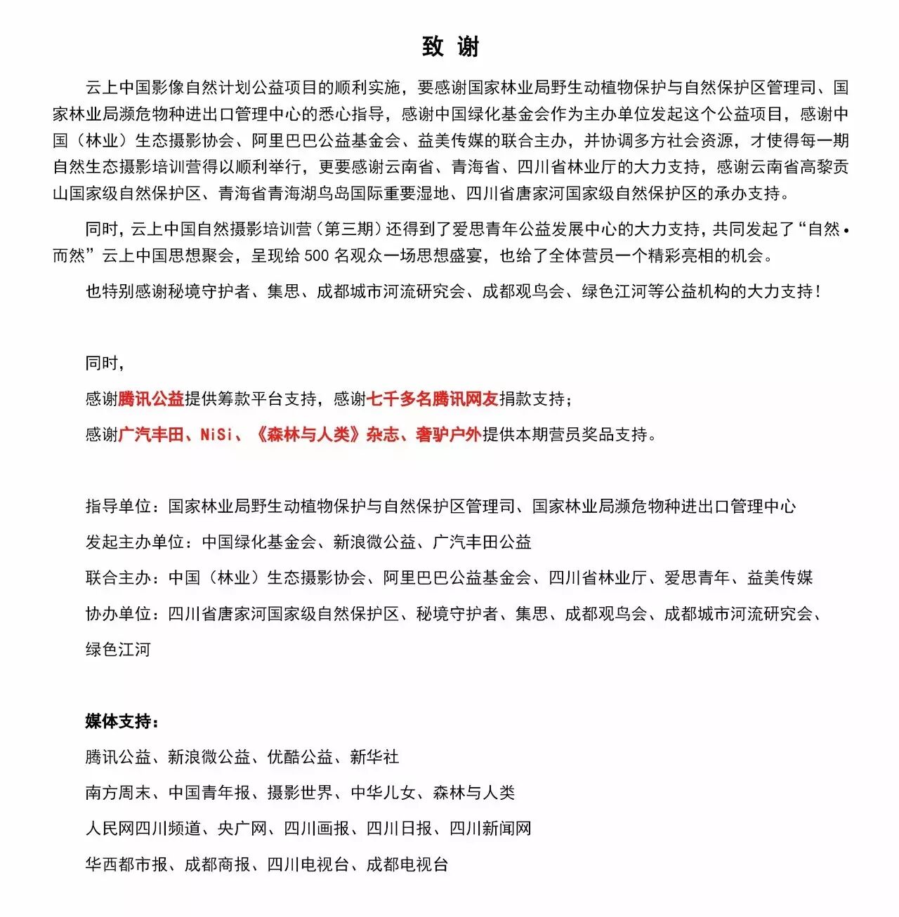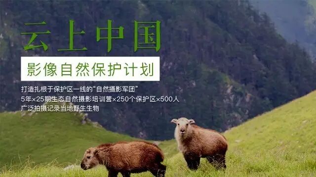 “云上中国影像自然保护计划”公益项目,由中国绿化基金会发起主办,并联合中国(林业)生态摄影协会、阿里巴巴公益基金会、益美传媒等社会资源,计划未来5年为中国250个保护区培训至少500名具有较高拍摄水平的一线巡护员,为中国的自然保护事业打造一支硬件和软件兼备的自然摄影军团!
