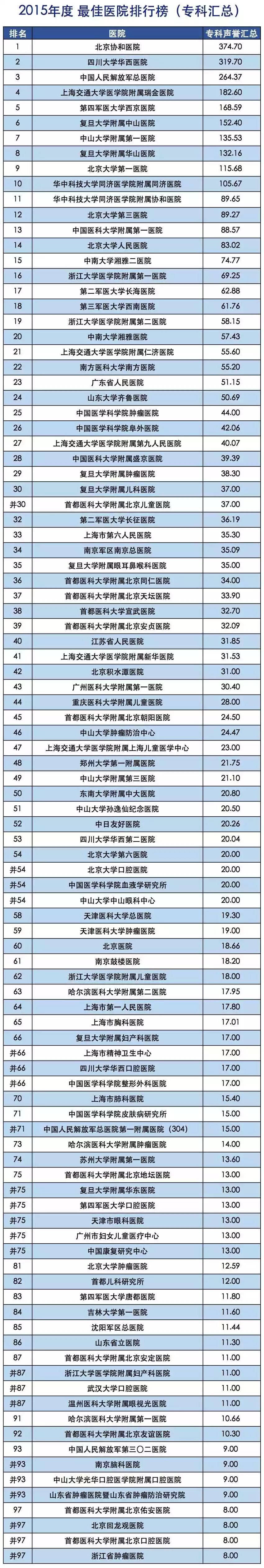 本报讯 (记者 孙国根) 由复旦大学医院管理研究所邀请全国37个临床专科的3969名国内著名同行专家担任评审的《2015年度中国最佳医院综合排行榜》和《2015年度中国医院最佳专科声誉排行榜》11月13日在上海发布,全国100家最佳医院和37个最佳专科名单揭晓,北京协和医院、。这是自2010年以来,复旦版中国最佳医院排行榜一年一度的第七次发布。