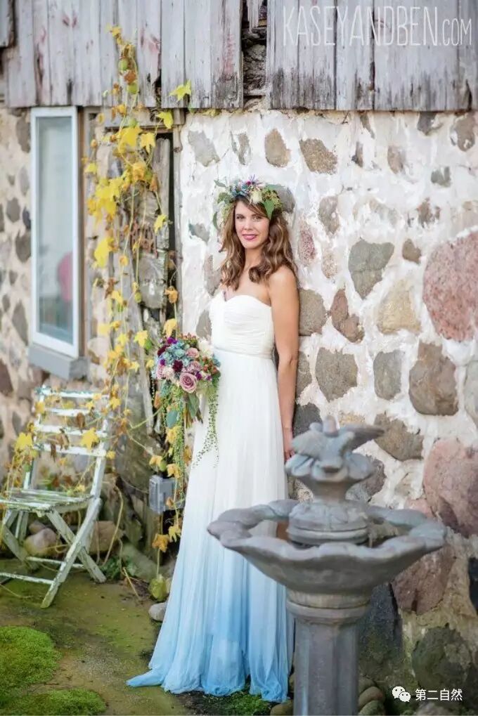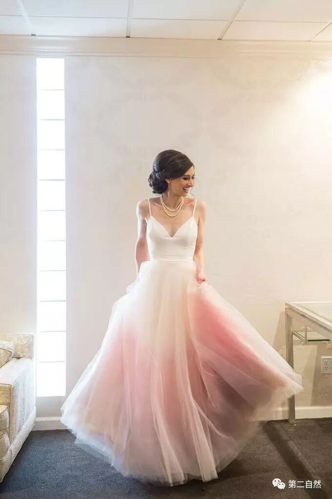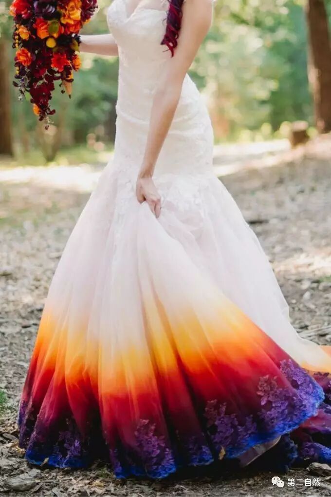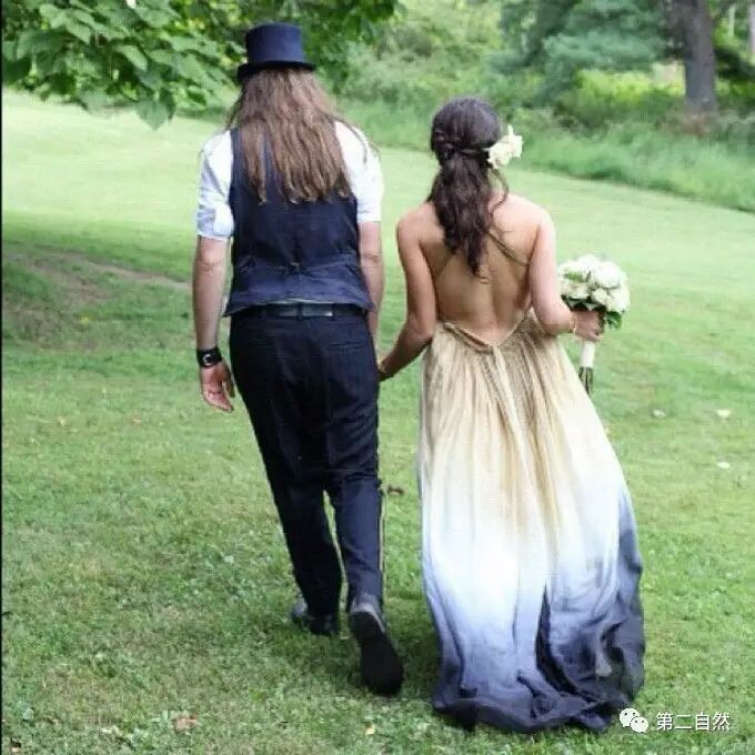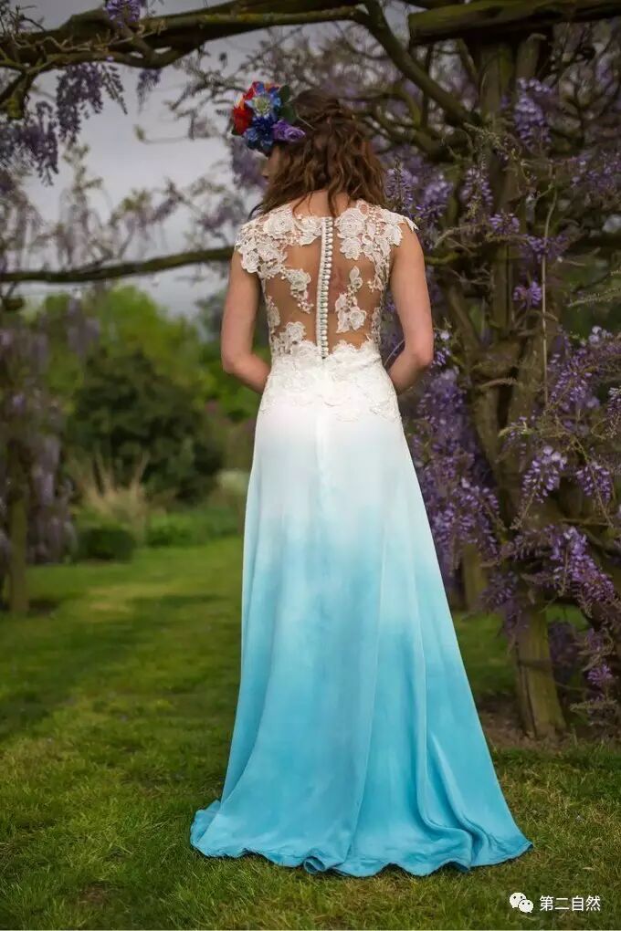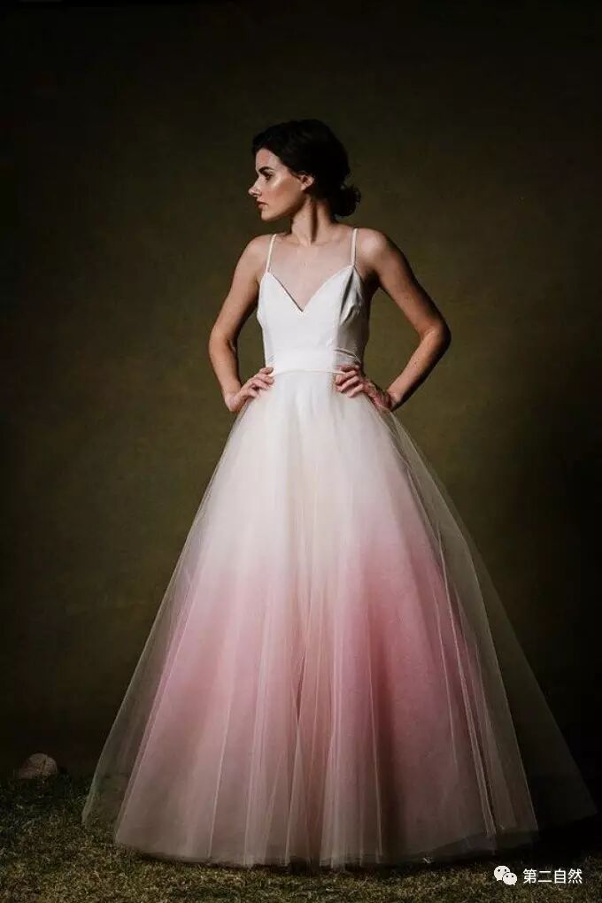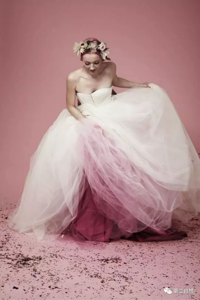 事实上,在Tumblr和Pinterest上,浸染的彩色礼服早已演变成一场场婚礼的时尚。艺术家Taylor Ann Linko在尝试过浸染后用喷枪喷色将自己的结婚礼服染出晚霞般的绚烂色彩,就好像艺术作品一样。
