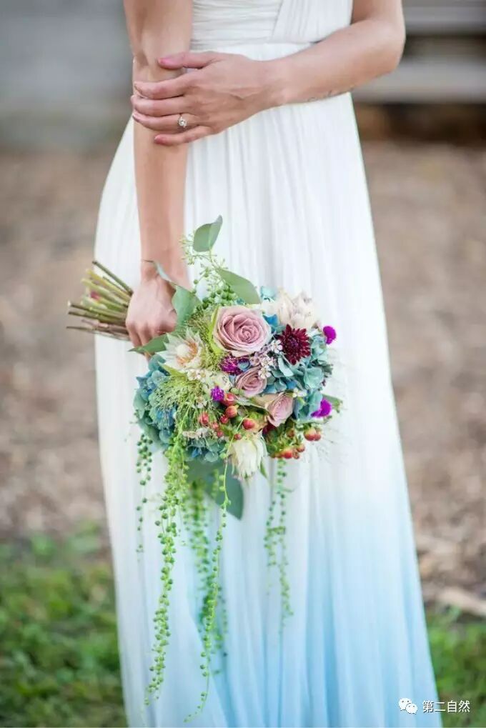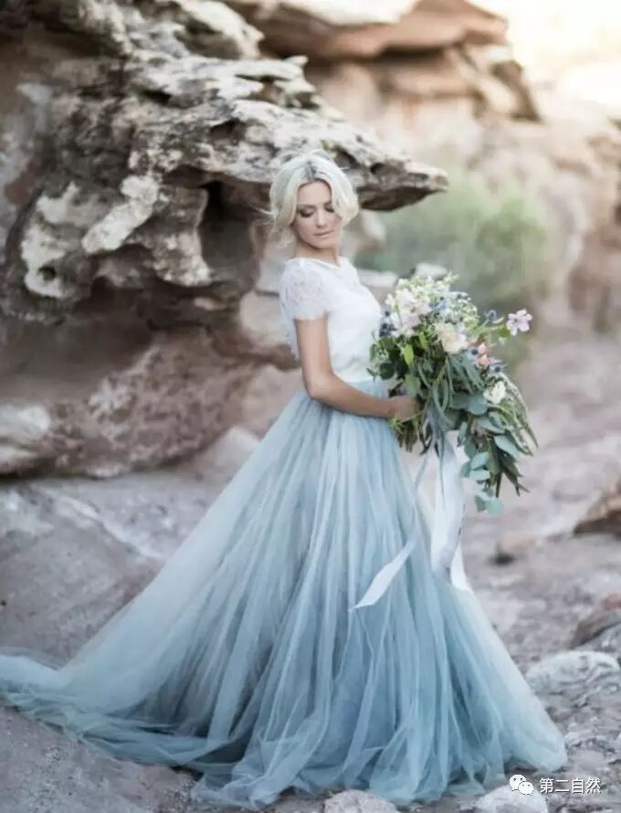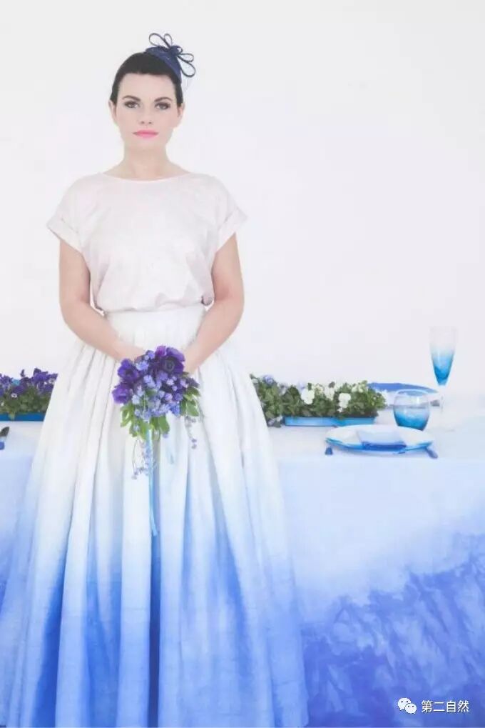 来自英国的新娘设计师 Lucy Scragg 钟爱大胆的亮色,将礼服手工浸染出渐变的蓝色,由明到暗,灵动的色彩尽显流水般的温柔。