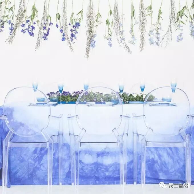 Elle是婚礼策划公司 “Inspire Hire” 的创立者,为新人们设计不同风格的婚礼。当她把一场手工浸染主题的婚礼册给客户看的时候,新娘被浸染所呈现出来的渐变色彩所吸引,手工浸染过的桌布、餐巾、婚礼服,柔和渐变的天空蓝简直让人产生置身海洋的错觉。