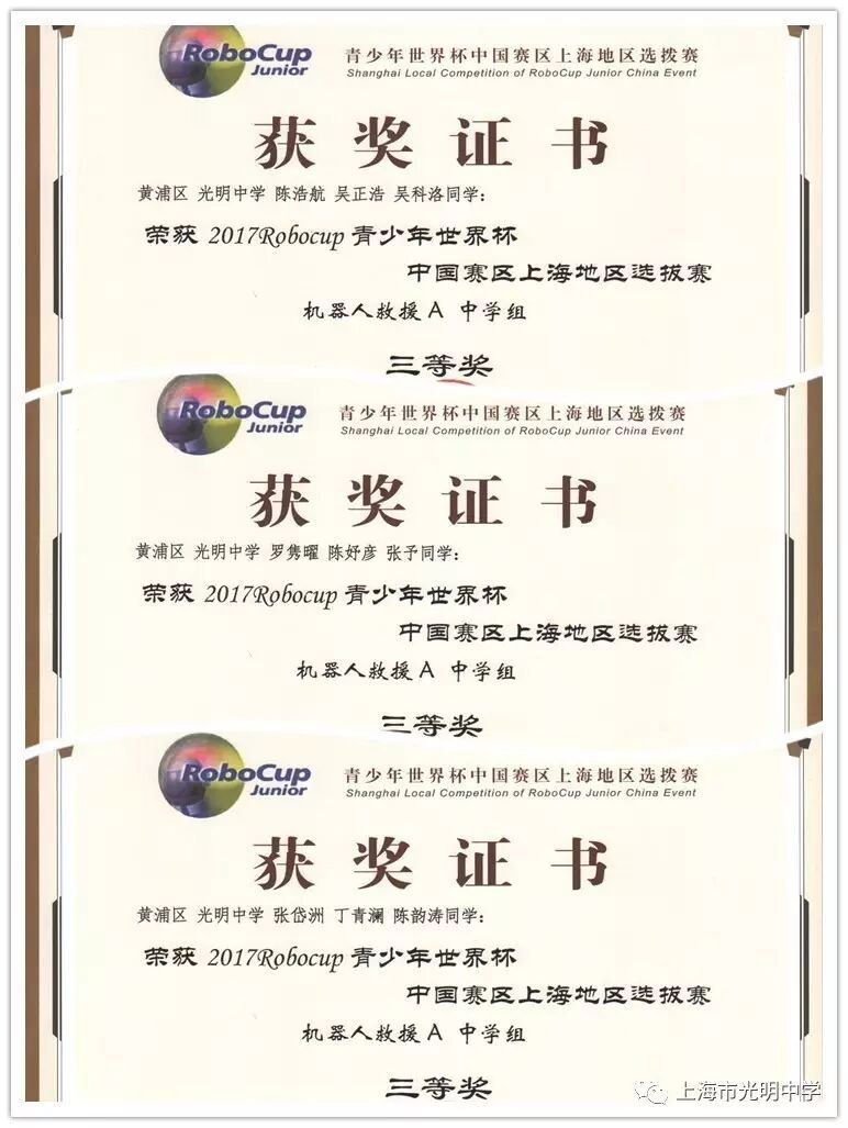 12月10日至11日,我校机器人社代表光明中学参加了2017RCJ上海地区选拔赛,最终获得三等奖。