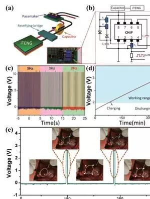 自供电起搏器样品原理图。(a)自供电起搏器的结构和照片;(b)起搏器样品的电路图(R1≈0~50kΩ,R2≈0~200kΩ,R3≈0~100kΩ,C1=10μF,C2=0.01μF);(c)自供电起搏器产生的不同频率的刺激脉冲;(d)植入式摩擦纳米发电机对电容器充电的充电曲线;(e)自供电起搏器刺激小鼠心跳(插图:自供电起搏器调节的小鼠心跳图片)