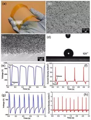 (a)在ITO 电极上制造的PDMS 膜照片;(b)带有金字塔结构的PDMS 表面的电镜照片;(c)PDMS 表面斜视的电镜照片;(d)PDMS 和水之间接触角的照片;(e)高达1000V的器件测得电压;(f)测得发电机的短路电荷密度;(g,h)在外接电阻100MΩ 下,测得发电机的输出电压和电荷密度(本图已获得美国化学会许可)