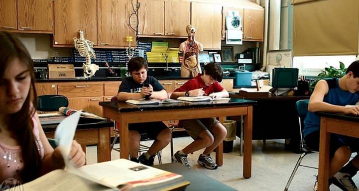 那这个讲究就是,窗户的位置是经过特别考虑的。在筛掉大部分选择后,我们最终决定使用了这间窗户靠东的教室。我想大家都已经猜到了原因:在没有灯具的情况下,太阳是我们最好的光源。太阳在早晨10点到11:30的时候,正好跟教室成45°角,正好给角色一个完美的主光(当然,我们重新挪动了桌子,创造了一个合适的角度)。