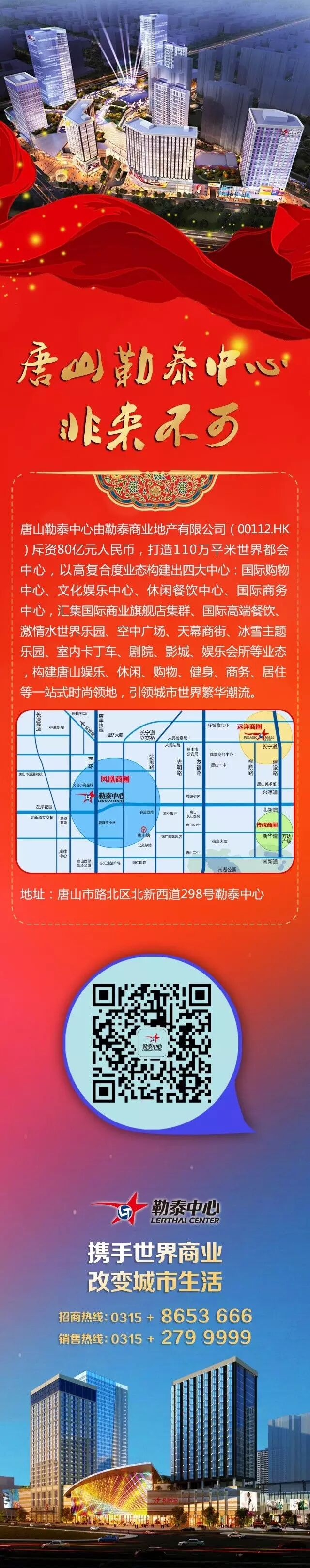唐山勒泰中心由中国勒泰商业地产集团倾力打造,座落于唐山市路北区的黄金区位,是集游乐、酒店、办公、购物、会所、高档公寓于一体的超大型城市综合体。