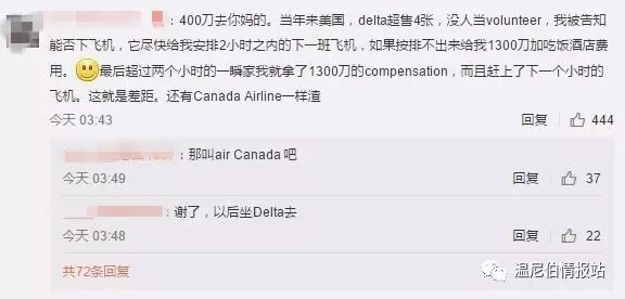 微博知名博主“北美吐槽君”也发布了该信息,很快就有了上千条回应。不少网友表示,美国和加拿大的航空公司常常出现“超额卖坐”的事情,令乘客倍感不便。