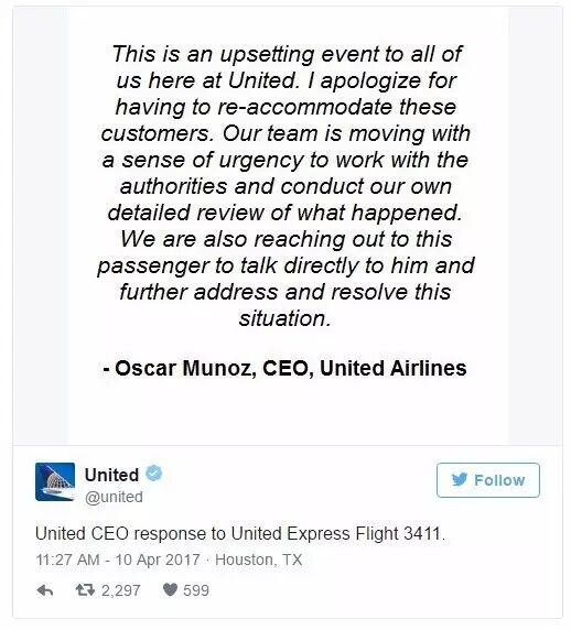 美联航的CEO Oscar Munoz也针对此事件评论称这次事件让公司所有人都非常沮丧。他对这些需要重新安排行程的乘客表示抱歉。他表示公司会直接联系那名男乘客来解决这个问题。