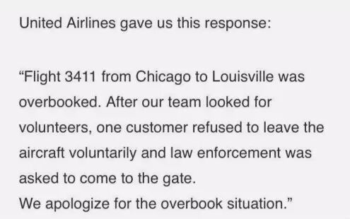 美联航公司在随后的一份声明中表示:“从芝加哥飞往Louisville的3411航班被超额预订了。我们在寻找了志愿者之后,一名乘客拒绝自动离开飞机,执法人员因此被要求进入机舱内进行处理。我们对于超额预订的情况深感歉意。”