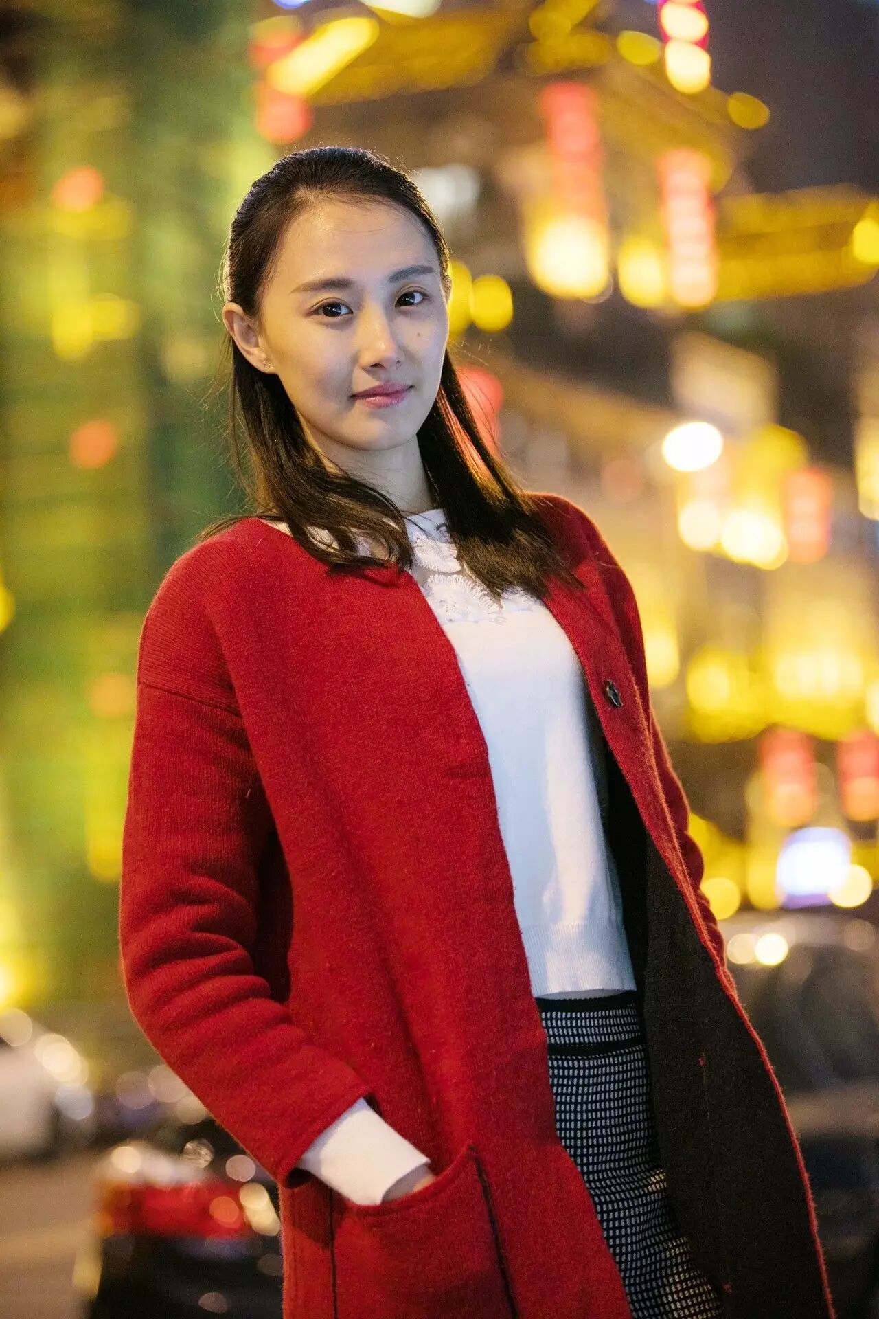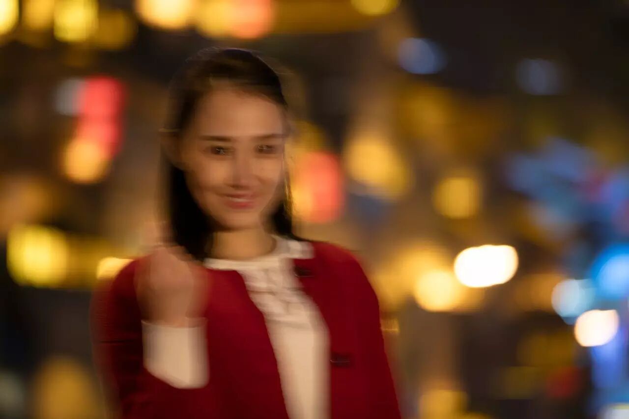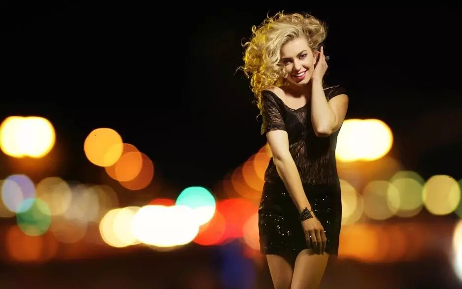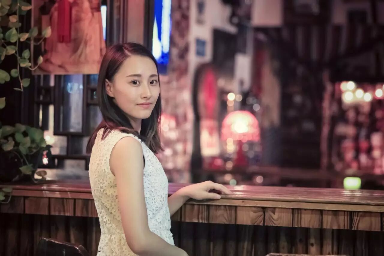 一张满意的夜景人像:应该有背景光斑,人物轮廓清新,发丝有细节。同样前景也应该有光源,让肤色均匀。比如这样的: