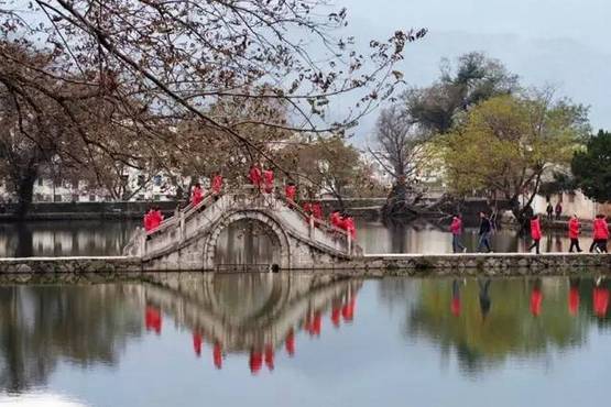 拍摄思路:当时在黄山的宏村拍湖上的拱桥,突然有一帮穿着统一红外套的导游从桥上过,就拍下来了。
