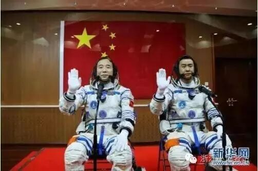 10月17日,神舟十一号航天员出征仪式在酒泉卫星发射中心举行。这是航天员景海鹏(左)、陈冬在出征前挥手。