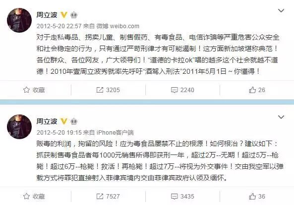 周立波曾在2012年5月20日连续发布两条微博谈论,甚至还表示“抓获制售毒食品者,超过5万--枪毙!”。