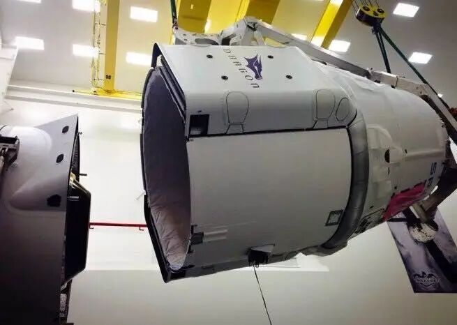 龙飞船的船箭组合过程,空洞洞的就是非加压货舱,其实就是个敞开的碳纤维储物架,侧面有龙飞船标志的是保护罩包裹的太阳能电池板