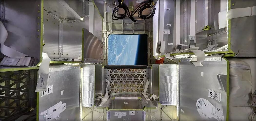 货运龙飞船的加压舱内部,都是标准的货运格架,对面这个窗口其实是龙飞船的侧舱门,按理来说一个货运飞船是不需要侧舱门的,可以说龙飞船从头到脚看起来根本就不像一个“正经”的货运飞船