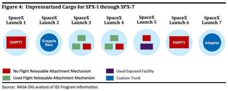 非加压货舱的货物配给,最夸张的是CRS-1和6任务中非加压舱竟然是空的,NASA好不容易在CRS-7中配置了一个重要货物(IDA),结果就给打飞了