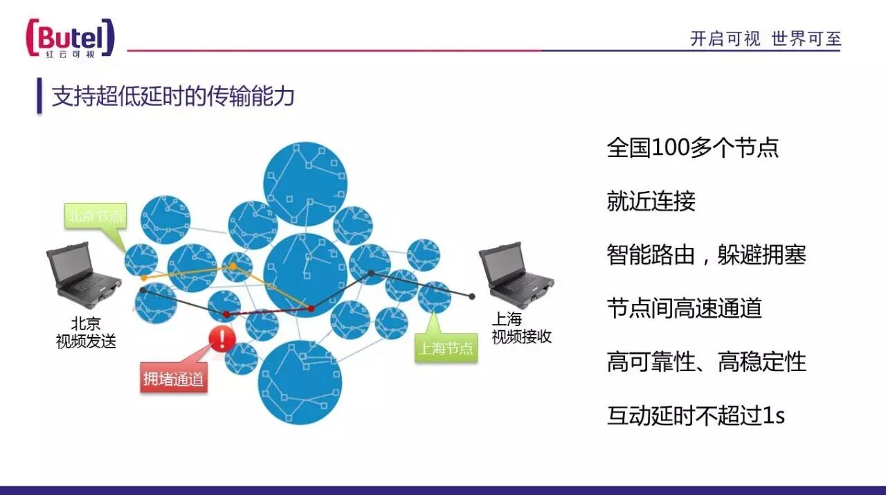 最后通过移动导播机完成直播画面的编辑并同步到Butel.net商业视频专网,全国100多个节点就近连接智能路由为电信级为直播传输分发提供有力保障,自主躲避拥塞节点间高速通道高可靠性、高稳定性互动延时不超过1s。
