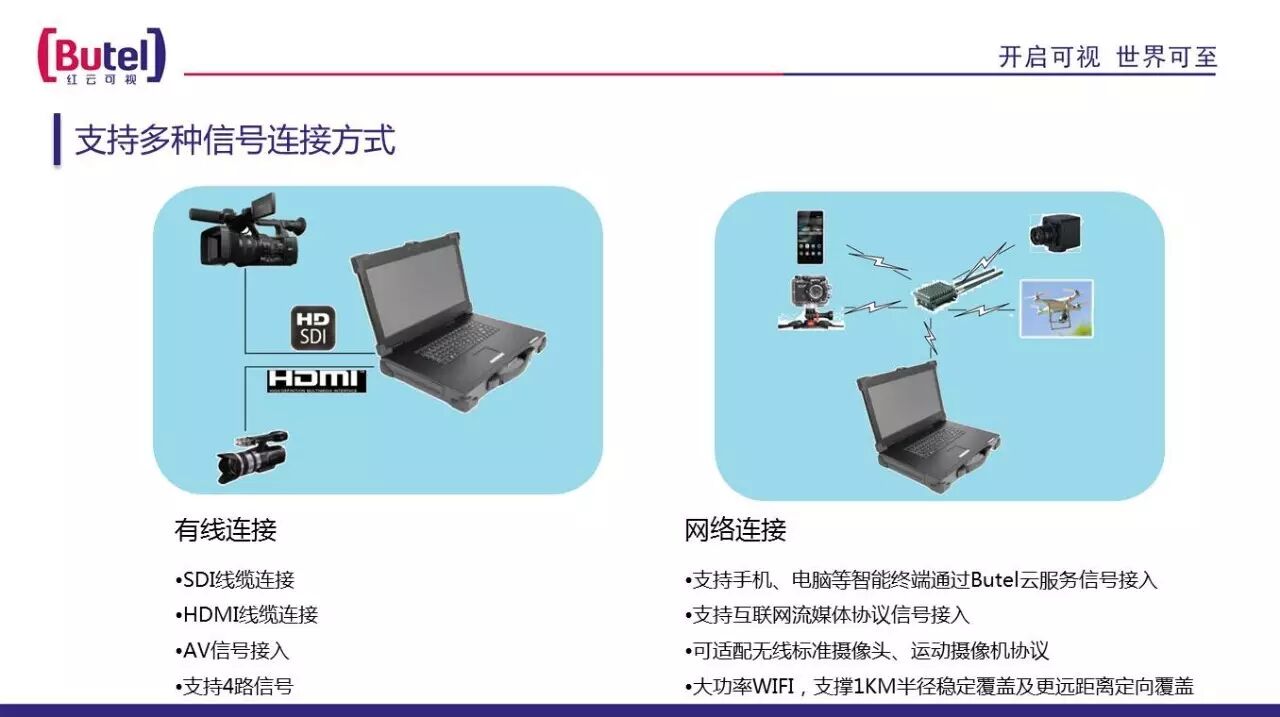 通过红云移动导播机将现场机位采集的多信号经过SDI线缆连接、HDMI线缆连接、AV信号接入等有线连接方式或智能终端接入Butel服务信号接入、互联网流媒体协议信号接入,甚至无线(运动)摄像机协议接入的无线连接方式实现多维度信号采集。