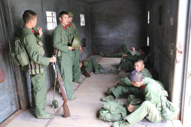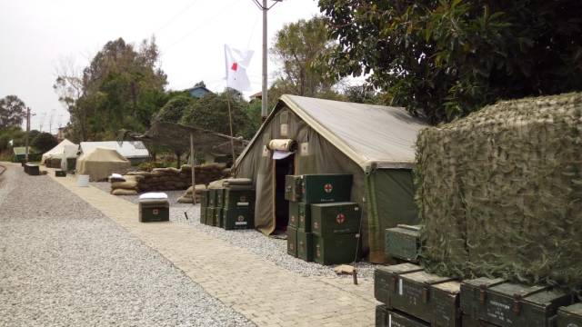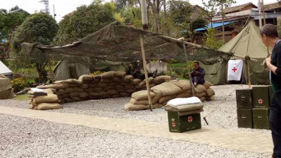 头戴钢盔帽,腰挂弹药夹、肩扛作战抢,一身军绿服饰加身,现场军用帐篷整齐排列,工事掩体、弹药箱成堆码放,小编仿佛置身于一个战后修整的“军事基地”。